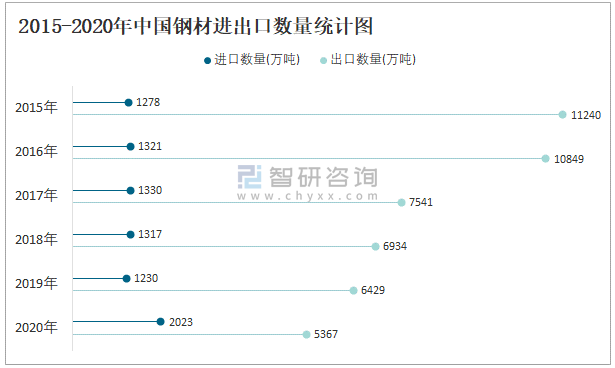 2015-2020年中國鋼材進出口數量統計圖