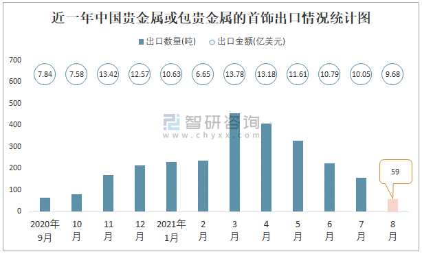 根據中國海關數據顯示:2021年8月中國貴金屬或包貴金屬的首飾出口數量為59噸,同比增長33.2%,出口金額為9.68億美元,同比增長62.4%;2021年1-8月中國貴金屬或包貴金屬的首飾出口數量為2089噸,出口金額為86.36億美元。