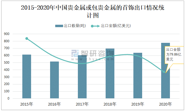 2015-2020年中國貴金屬或包貴金屬的首飾出口情況統計圖