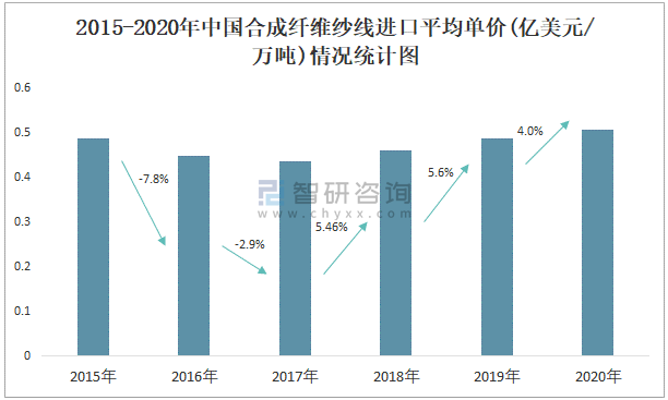 2015-2020年中國合成纖維紗線出口平均單價(億美元/萬噸)情況統計圖