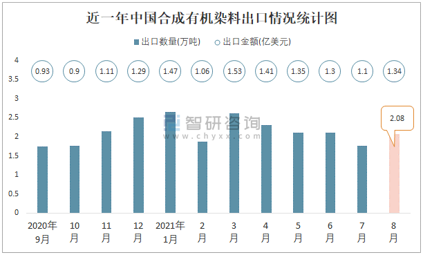 根據(jù)中國(guó)海關(guān)數(shù)據(jù)顯示:2021年8月中國(guó)合成有機(jī)染料出口數(shù)量為2.08萬(wàn)噸,同比增長(zhǎng)18.5%,出口金額為1.34億美元,同比增長(zhǎng)54.5%;2021年1-8月中國(guó)合成有機(jī)染料出口數(shù)量為17.5萬(wàn)噸,出口金額為10.56億美元。