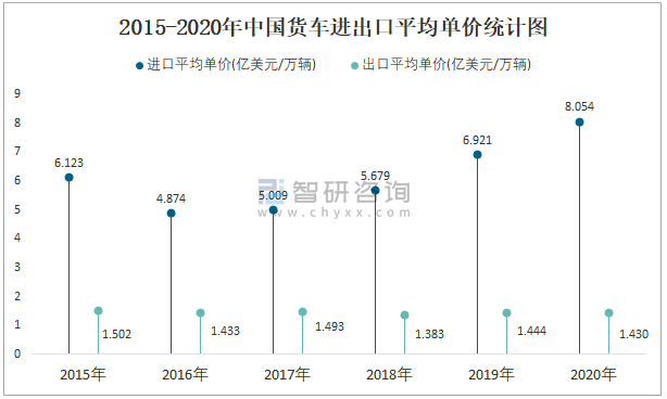 根據中國海關數據顯示:2015-2020中國貨車進口數量總體低于出口數量,進口數量在2019年達到最大值,此后有所下降,出口數量在2016年跌至最低值,此后有所回升,2015-2020中國貨車進出口平均單價存在明顯幅度的波動。