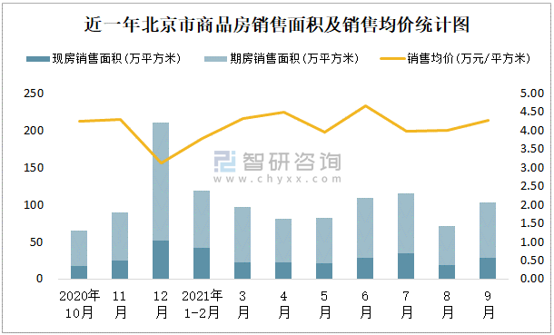 近一年北京市商品房銷售面積及銷售均價統(tǒng)計(jì)圖