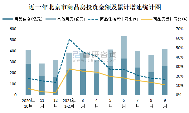 根據(jù)國家統(tǒng)計(jì)局?jǐn)?shù)據(jù)統(tǒng)計(jì)可知:2021年9月北京市房地產(chǎn)開發(fā)投資商品房投資金額為419.76億元(其中商品住宅為264.19億元,辦公樓、商業(yè)營業(yè)用房等其他用房155.57億元);2021年1-9月北京市房地產(chǎn)開發(fā)投資商品房累計(jì)投資金額為3233.4億元,投資金額累計(jì)同比增長10.8%。