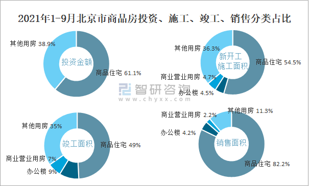 2021年1-9月北京市商品房投資、施工、竣工、銷售分類占比