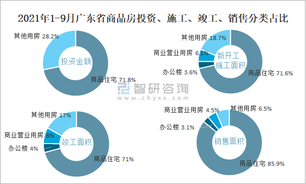 2021年1-9月廣東省商品房投資、施工、竣工、銷售分類占比