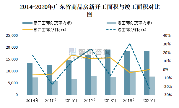 2014-2020年廣東省商品房新開工面積與竣工面積對比圖