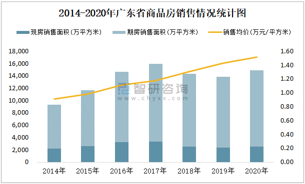 根據國家統計局數據統計可知:2021年9月廣東省商品房銷售面積為1170.43萬平方米(其中銷售現房214.26萬平方米,期房956.17萬平方米),銷售額為1866.65億元,銷售均價約為1.59萬元/平方米;2021年1-9月廣東省商品房累計銷售面積為10232.45萬平方米,銷售面積累計同比增長6.6%,累計銷售額為16414.47億元,銷售額累計同比增長16%;2014-2020年廣東省商品房總銷售面積2017年達到最高值,此后有所下滑,其中期房銷售面積大大高于現房銷售面積,銷售均價逐年遞增。