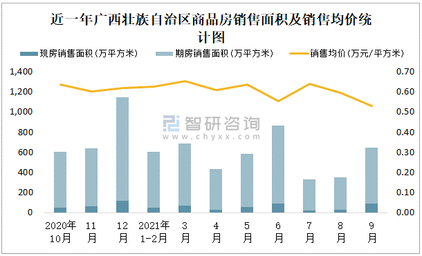 2021年9月廣西壯族自治區(qū)銷(xiāo)售商品房643.22萬(wàn)平方米銷(xiāo)售均價(jià)約為0.53萬(wàn)元/平方米
