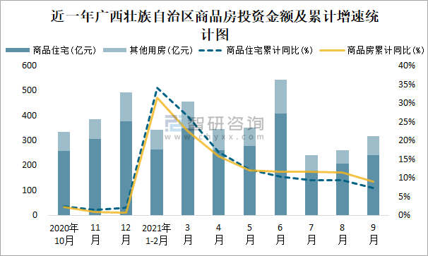 根據(jù)國(guó)家統(tǒng)計(jì)局?jǐn)?shù)據(jù)統(tǒng)計(jì)可知:2021年9月廣西壯族自治區(qū)房地產(chǎn)開(kāi)發(fā)投資商品房投資金額為317.48億元(其中商品住宅為240.93億元,辦公樓、商業(yè)營(yíng)業(yè)用房等其他用房76.55億元);2021年1-9月廣西壯族自治區(qū)房地產(chǎn)開(kāi)發(fā)投資商品房累計(jì)投資金額為2866.55億元,投資金額累計(jì)同比增長(zhǎng)9%。