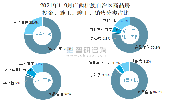 2021年1-9月廣西壯族自治區(qū)商品房投資、施工、竣工、銷(xiāo)售分類(lèi)占比