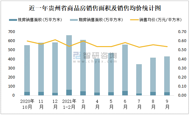 根據(jù)國家統(tǒng)計局數(shù)據(jù)統(tǒng)計可知:2021年9月貴州省商品房銷售面積為430.09萬平方米(其中銷售現(xiàn)房33.71萬平方米,期房396.38萬平方米),銷售額為231.38億元,銷售均價約為0.54萬元/平方米;2021年1-9月貴州省商品房累計銷售面積為3889.59萬平方米,銷售面積累計同比增長1.4%,累計銷售額為2158.8億元,銷售額累計同比下降2.3%;2014-2020年貴州省商品房總銷售面積逐年遞增,其中期房銷售面積大大高于現(xiàn)房銷售面積,銷售均價2019年達到最高值,此后有所下滑。