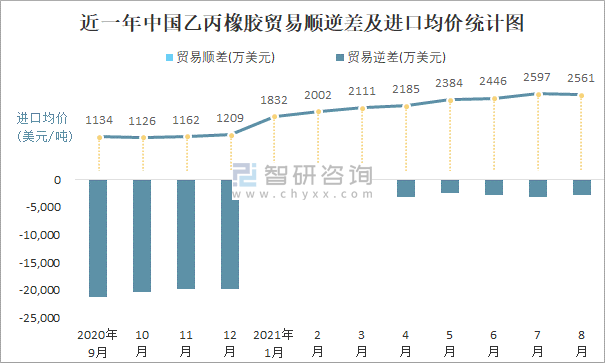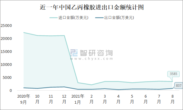 根據中國石油和化學工業聯合會數據顯示:2021年8月中國乙丙橡膠進口數量為1.4萬噸,出口數量為0.3萬噸;進口金額為3585萬美元,出口金額為837萬美元;近一年中國乙丙橡膠出口總金額小于進口總金額,貿易逆差為主,8月進口均價2561美元/噸。