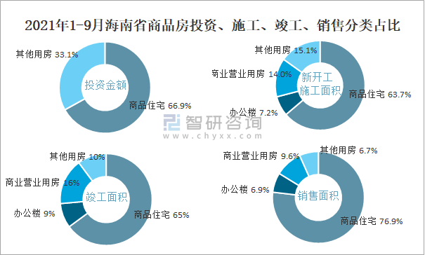 2021年1-9月海南省商品房投資、施工、竣工、銷售分類占比