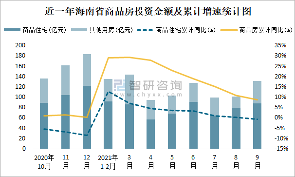 根據國家統計局數據統計可知:2021年9月海南省房地產開發投資商品房投資金額為131.81億元(其中商品住宅為87.91億元,辦公樓、商業營業用房等其他用房43.9億元);2021年1-9月海南省房地產開發投資商品房累計投資金額為936.72億元,投資金額累計同比增長8.9%。