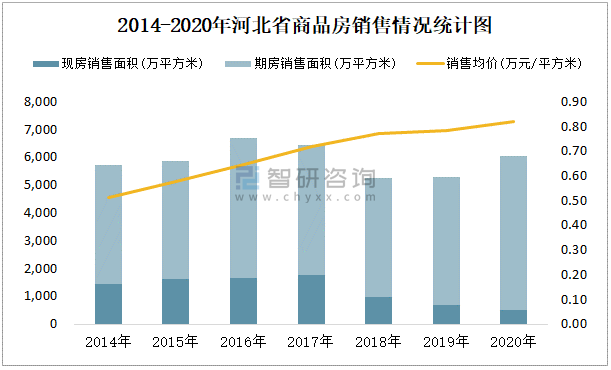 根據國家統計局數據統計可知:2021年9月河北省商品房銷售面積為577.55萬平方米(其中銷售現房38.94萬平方米,期房538.61萬平方米),銷售額為412.66億元,銷售均價約為0.71萬元/平方米;2021年1-9月河北省商品房累計銷售面積為4219.73萬平方米,銷售面積累計同比增長12.4%,累計銷售額為3417.81億元,銷售額累計同比增長9.3%;2014-2020年河北省商品房總銷售面積2016年達到最高值,此后有所下滑,其中期房銷售面積大大高于現房銷售面積,銷售均價逐年遞增。