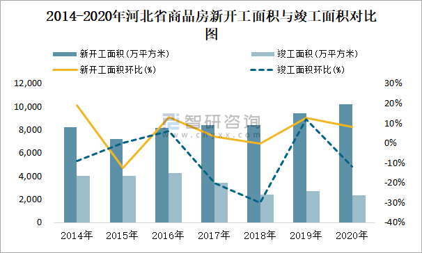 2014-2020年河北省商品房新開工面積與竣工面積對比圖