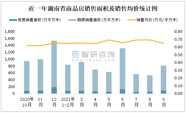 近一年湖南省商品房銷售面積及銷售均價統計圖