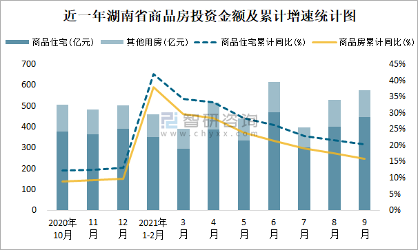 根據國家統計局數據統計可知:2021年9月湖南省房地產開發投資商品房投資金額為576.76億元(其中商品住宅為445.8億元,辦公樓、商業營業用房等其他用房130.96億元);2021年1-9月湖南省房地產開發投資商品房累計投資金額為3922.64億元,投資金額累計同比增長15.8%。
