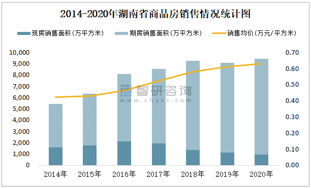 根據國家統計局數據統計可知:2021年9月湖南省商品房銷售面積為813.79萬平方米(其中銷售現房86.02萬平方米,期房727.77萬平方米),銷售額為526.74億元,銷售均價約為0.65萬元/平方米;2021年1-9月湖南省商品房累計銷售面積為6303.79萬平方米,銷售面積累計同比增長5.8%,累計銷售額為4171.07億元,銷售額累計同比增長11.3%;2014-2020年湖南省商品房總銷售面積2020年達到最高值,此后有所下滑,其中期房銷售面積大大高于現房銷售面積,銷售均價逐年遞增。