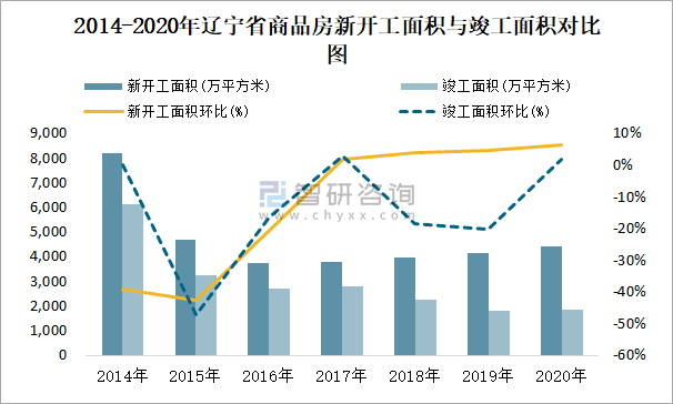 2014-2020年遼寧省商品房新開工面積與竣工面積對比圖