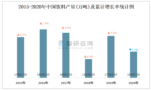 2015-2020年中國飲料產量及累計增長率統計圖