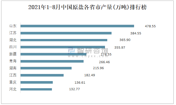 2021年1-8月中國原鹽各省市產量排行榜