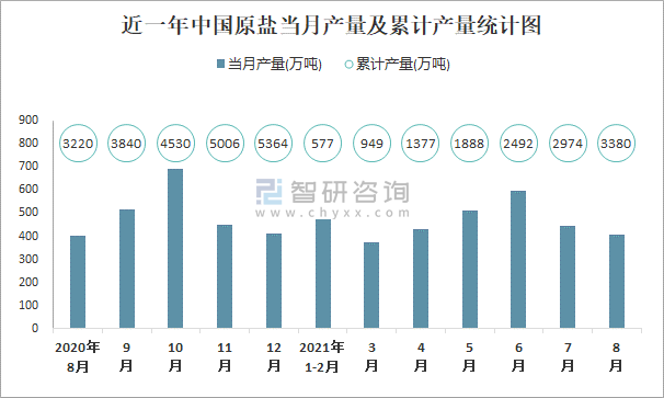 近一年中國原鹽當月產量及累計產量統計圖