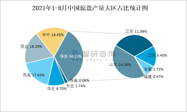 2021年1-8月中國原鹽產量大區占比統計圖