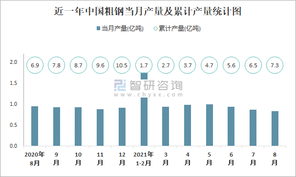 根據(jù)國家統(tǒng)計(jì)局?jǐn)?shù)據(jù)顯示:2021年8月中國粗鋼產(chǎn)量為0.8億噸,同比下降13.2%;2021年1-8月中國粗鋼累計(jì)產(chǎn)量為7.3億噸,累計(jì)增長5.3%;2015-2020年中國粗鋼產(chǎn)量逐年遞增,2020年達(dá)到最高。