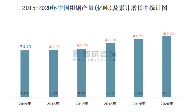 2015-2020年中國粗鋼產(chǎn)量及累計(jì)增長率統(tǒng)計(jì)圖
