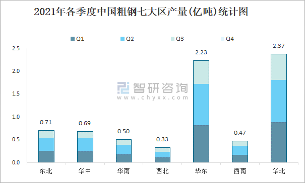2021年各季度中國粗鋼七大區(qū)產(chǎn)量統(tǒng)計(jì)圖
