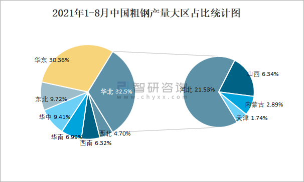 2021年1-8月中國粗鋼產(chǎn)量大區(qū)占比統(tǒng)計(jì)圖