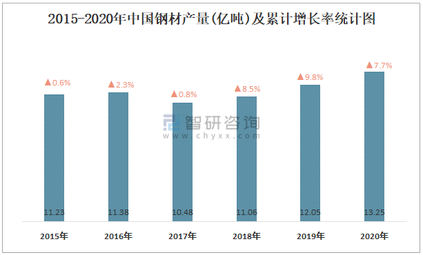 2015-2020年中國鋼材產(chǎn)量及累計增長率統(tǒng)計圖