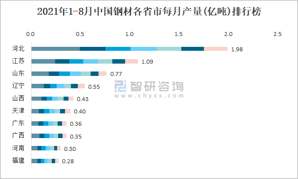 2021年1-8月中國鋼材各省市每月產(chǎn)量排行榜
