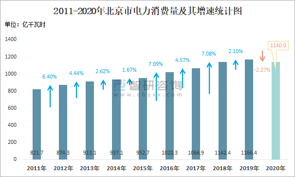 根據國家統計局數據統計可知:2011-2020年北京市發電量有所波動,總體呈現上升趨勢,從發電量類型來看,火力發電量占比最大(2020年占比為97.24%),且近10年有所波動,總體呈現上升趨勢;2011-2020年北京市電力消費量(實物量)有所波動,總體呈現下降趨勢,2015年-2016年之間增幅最大,為7.09%,2020年北京市電力消費量(實物量)達到1139.97億千瓦時。