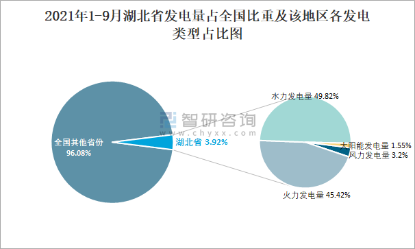 2021年1-9月湖北省發(fā)電量占全國(guó)比重及該地區(qū)各發(fā)電類型占比圖