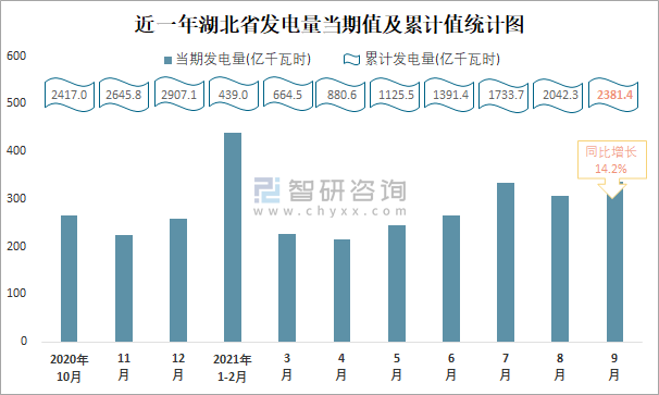 近一年湖北省發(fā)電量當(dāng)期值及累計(jì)值統(tǒng)計(jì)圖