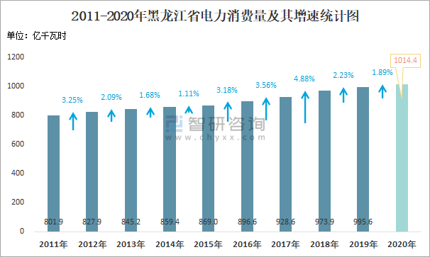 2011-2020年黑龍江省電力消費(fèi)量及其增速統(tǒng)計(jì)圖