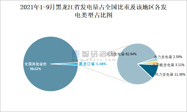 2021年1-9月黑龍江省發(fā)電量占全國(guó)比重及該地區(qū)各發(fā)電類型占比圖
