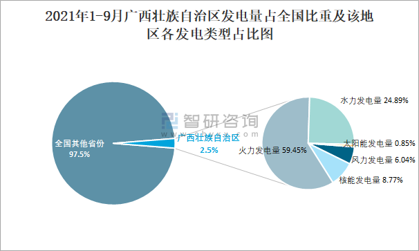 2021年1-9月廣西壯族自治區發電量占全國比重及該地區各發電類型占比圖