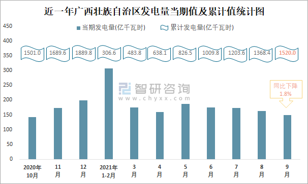 近一年廣西壯族自治區發電量當期值及累計值統計圖