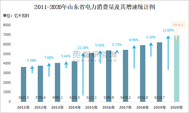 2011-2020年山東省電力消費量及其增速統計圖