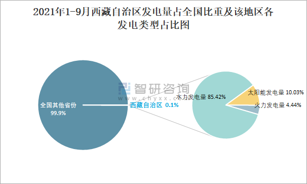 2021年1-9月西藏自治區發電量占全國比重及該地區各發電類型占比圖