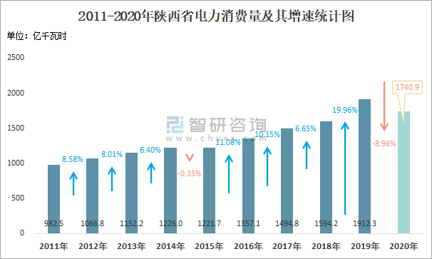 根據國家統計局數據統計可知:2011-2020年陜西省發電量有所波動,總體呈現上升趨勢,從發電量類型來看,火力發電量占比最大(2020年占比為88.17%),且近10年有所波動,總體呈現上升趨勢;2011-2020年陜西省電力消費量(實物量)有所波動,總體呈現下降趨勢,2018年-2019年之間增幅最大,為19.96%,2020年陜西省電力消費量(實物量)達到1740.9億千瓦時。