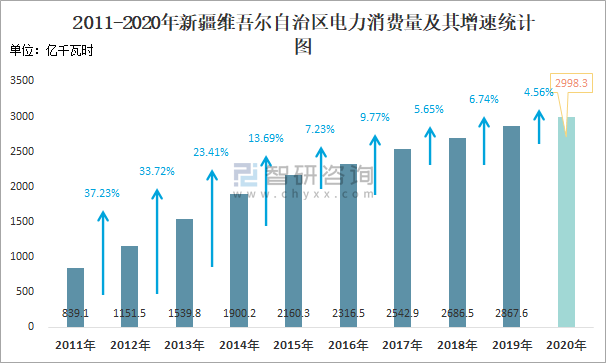 2011-2020年新疆維吾爾自治區電力消費量及其增速統計圖