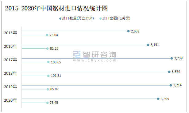 2015-2020年中國鋸材進口情況統計圖