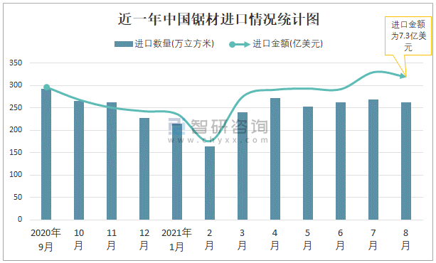 2021年8月中國鋸材進口數量和進口金額分別為262萬立方米和7.3億美元