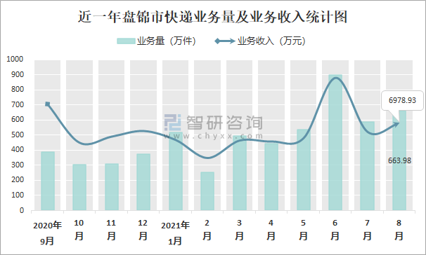 2021年8月盤錦市快遞業務量與業務收入分別為663.98萬件和6978.93萬元