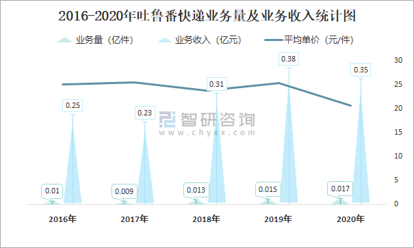 2016-2020年吐魯番快遞業務量及業務收入統計圖